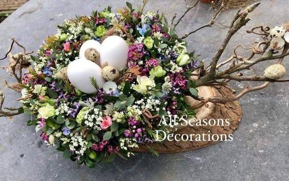 Pour cet atelier, je vous propose de partir sur l’idée d’un nid de Pâques fleuris. Sur une base de mousse florale, nous créerons une composition circulaire avec des fleurs fraiches et des œufs d’oie. Vous aurez également toute une série de décorations vous permettant de personnaliser votre composition telles que des œufs de cailles de différentes couleurs, des plumes,… Les photos issues de Pinterest ci-dessous vous donnent une idée des techniques qui seront utilisées. La composition finale sera cependant différente, colorée et lumineuse.![]()